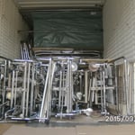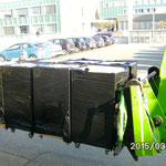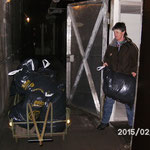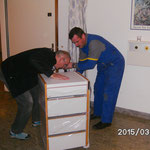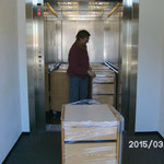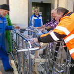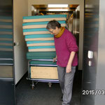 Die umwickelten Nachttische werden von Silvia Wälti via Lift zum Camion gebracht und von Hans Haldemann umgehend in den LKW gehievt, streng beobachtet von unserem Helfer Ruedi Minnig vom Rotary Club Saanenland/Gstaad und einem Mitarbeiter vom technischen Dienst des Kantonsspital Olten