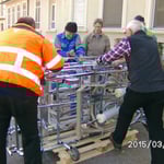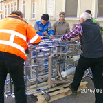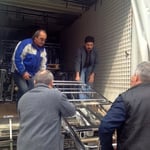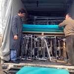 45 Spitalbetten werden in Teamarbeit zusammengestellt und sorgfältig und konzentriert in den Camion geladen