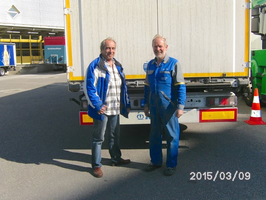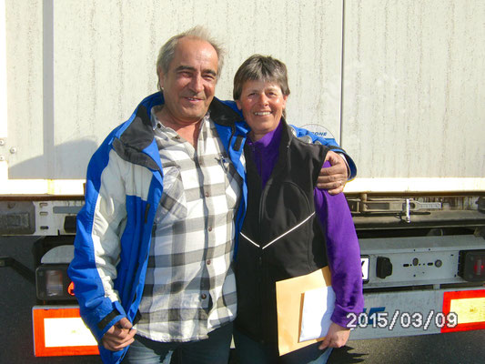 14.30 Uhr: Der LKW ist einmal mehr von Manuela Scherrer von der Firma Kühle + Nagel AG in Bern speditiv verzollt und verplombt. Georgi wird vom Präsidenten Andreas Thöni und der Sekretärin und Kassieren Rosmarie Chlouda verabschiedet - und los geht's - VIA BULGARIA