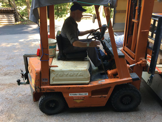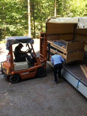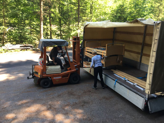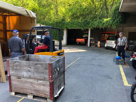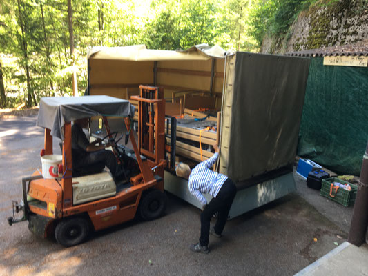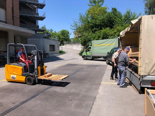Nun ist Team Reichenbach am Zug. Kaum ist der erste Anhänger im Lager eingetroffen hilft Monika Nägeli Werner Thöni und Hans Haldemann fachgerecht beim abladen.