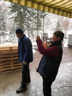 Unser Camion steht pünktlich an der Strasse zu unserem Lager, doch leider ist die Strasse schon wieder Schneebedeckt. Wir sind froh, dass wir den Fahrer Nikolai bereits kennen und er die Gegebenheiten zu unserem Lager genau weiss. Also: Schneeketten am LKW montieren.