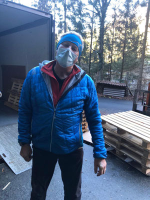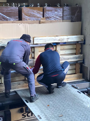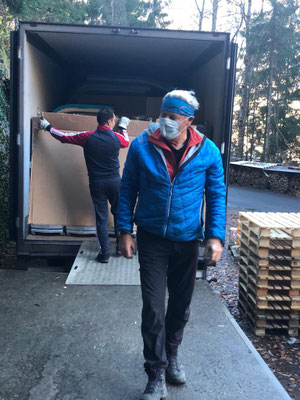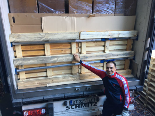Eigentlich war die Ankunft des LKW auf 13.00 avisiert worden. Als wir um 9.30 Uhr beim Lager eintrafen, um noch ein paar Vorbereitungsarbeiten zu treffen, stand unser bekannter Fahrer Nikolai bereits mit seinem LKW an der Rampe. Die Überraschung war gross!